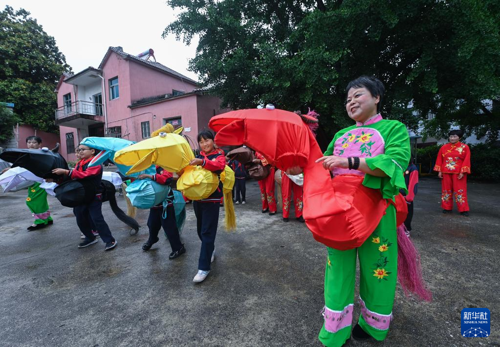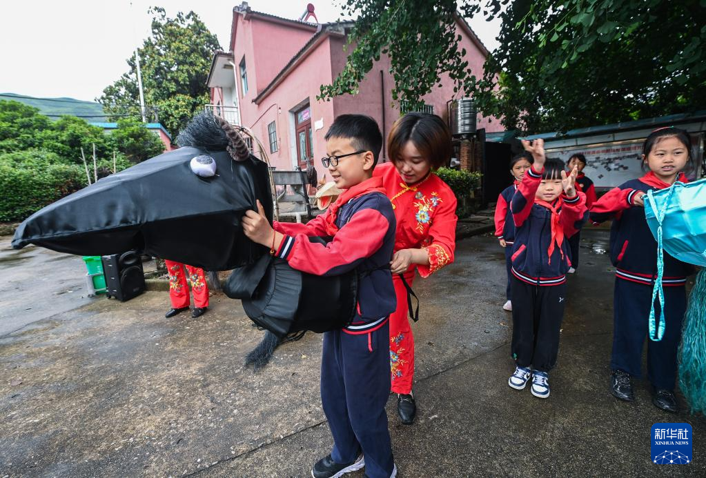 5月24日,長興縣煤山鎮中心小學的學生在新民村學習新民馬燈舞蹈。