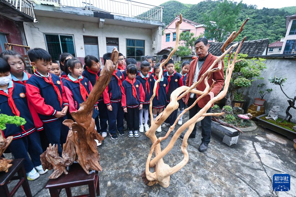 5月24日,煤山鎮新民村非遺傳承人佘廣坤(右一)在給長興縣煤山鎮中心小學的學生介紹根雕藝術。