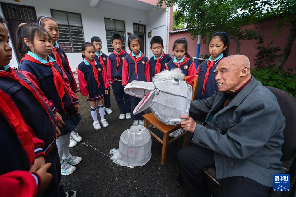 5月24日,煤山鎮新民村92歲的非遺傳承人許梅盛(右一)正在給長興縣煤山鎮中心小學的學生介紹新民馬燈的制作過程。