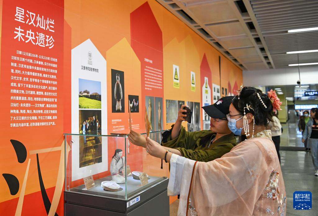 游客在西安地鐵大雁塔站“星漢燦爛·未央遺珍——漢”主題展覽上打卡留念(5月27日攝)。
