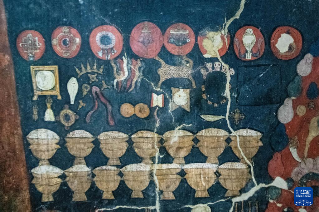 這是5月26日拍攝的皮央石窟壁畫中的吉祥八寶。