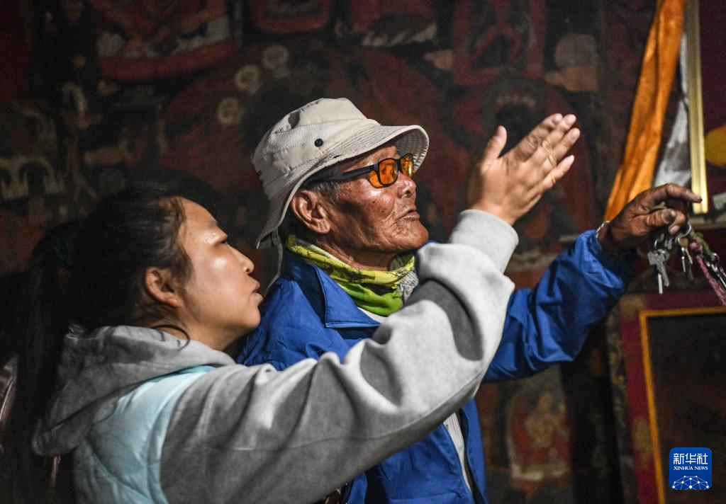皮央和東嘎石窟遺址文保員仁增旺扎老人給游客講解壁畫(5月26日攝)。