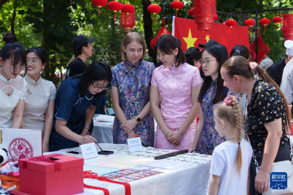 5月27日,人們在烏茲別克斯坦首都塔什干的中央公園體驗中國書法。新華社發(格奧爾吉·納馬佐夫攝)