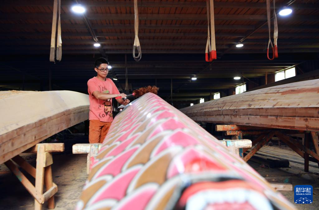 5月31日,福州市閩侯縣南通鎮方莊村方忠雄龍舟廠的方劍偉擦拭新龍舟進行。