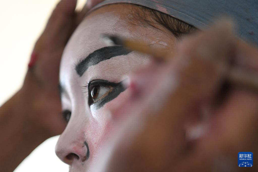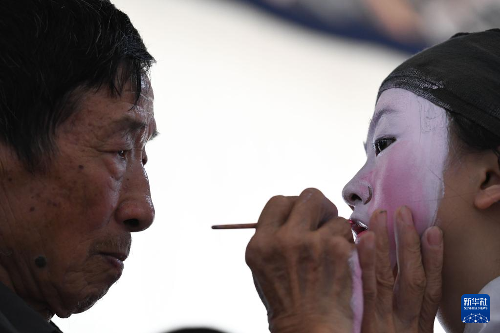 5月30日,民間老藝人在給“徽劇童子班”學生化妝。