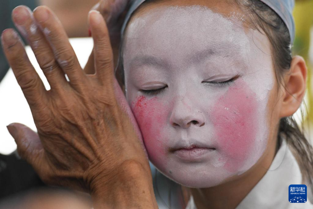 5月30日,民間老藝人在給伏嶺鎮中心小學“徽劇童子班”的學生化妝。