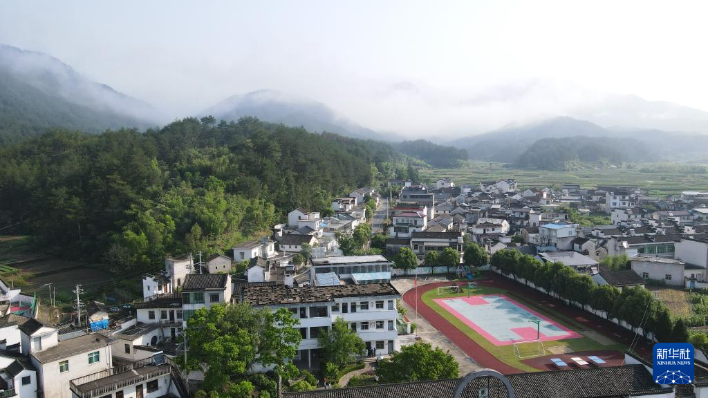 這是5月30日拍攝的安徽省宣城市績溪縣伏嶺村,畫面右下為伏嶺鎮中心小學(無人機照片)。