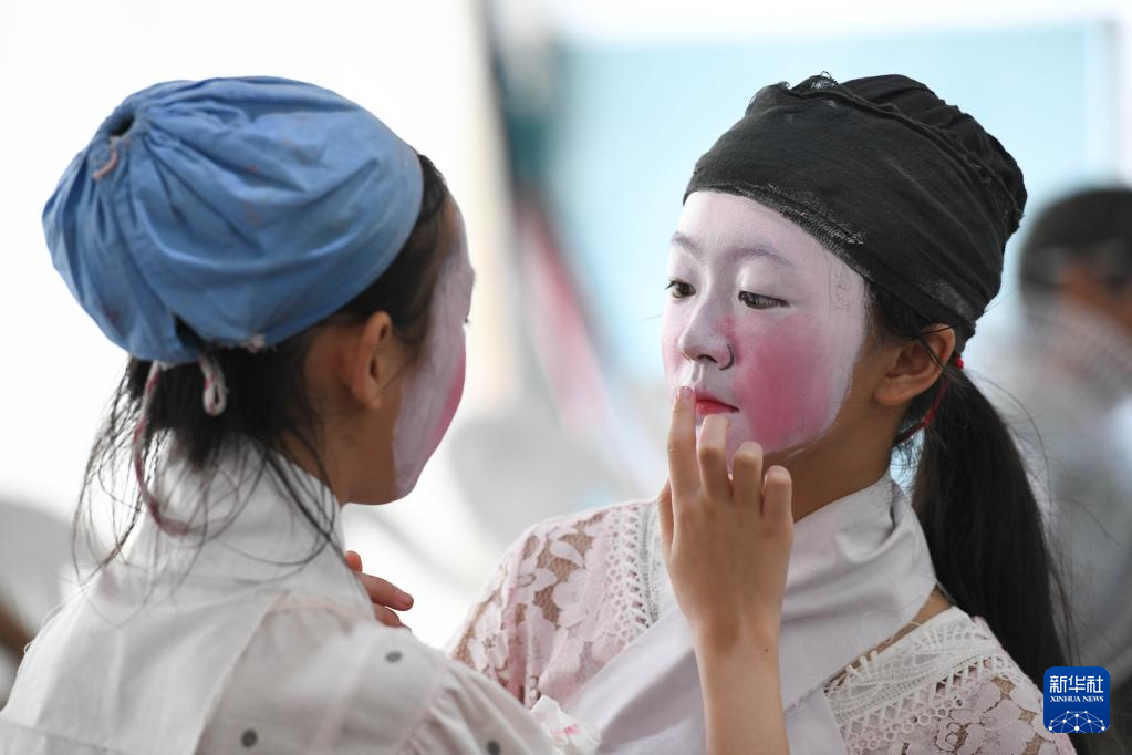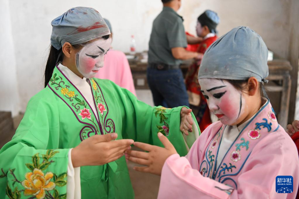 5月30日,伏嶺鎮中心小學“徽劇童子班”學生方甜甜和王玉琴(右)在化妝時交流。