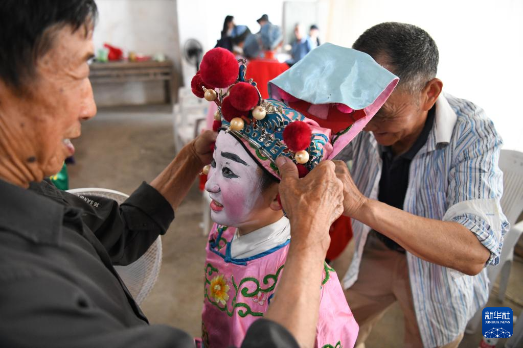 5月30日,民間老藝人在給9歲的伏嶺鎮中心小學“徽劇童子班”學生方冬冬(中)固定頭飾。