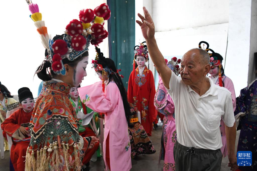 5月29日,民間老藝人邵千峰(左)在徽劇展演排練時指導一名伏嶺鎮中心小學“徽劇童子班”的學生。
