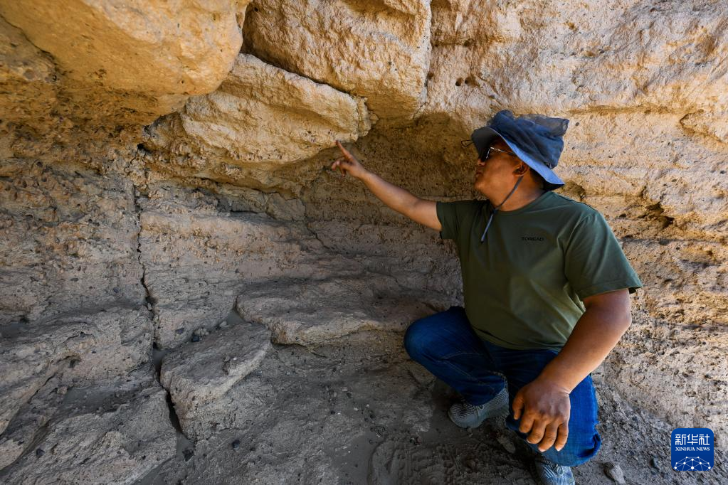 6月2日,額濟納旗文物保護中心工作人員在居延遺址附近查看散落的陶片。