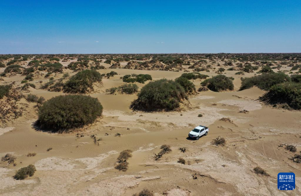 6月2日,額濟納旗文物保護中心工作人員在戈壁灘上巡護(無人機照片)。