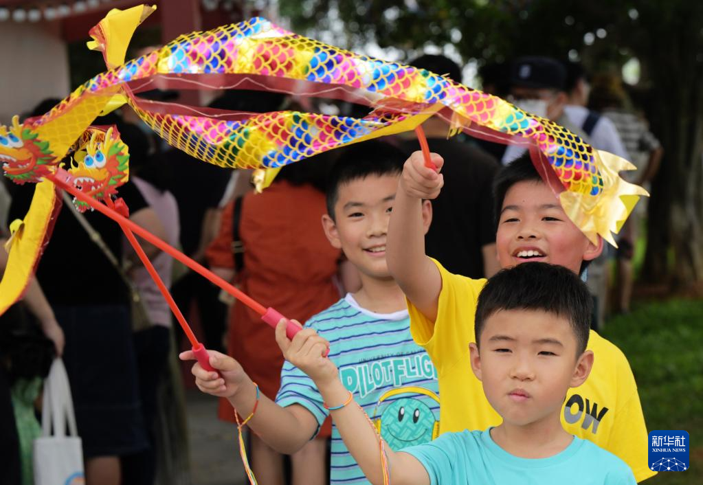6月3日,廈門小學生在2023海峽兩岸(集美)龍舟文化節活動現場體驗舞龍。