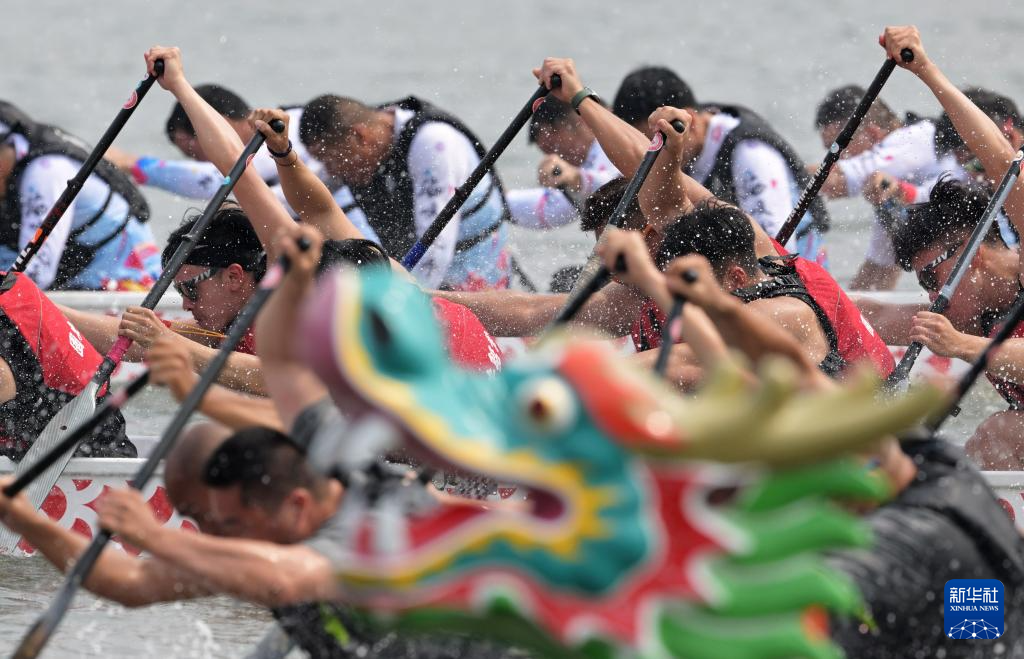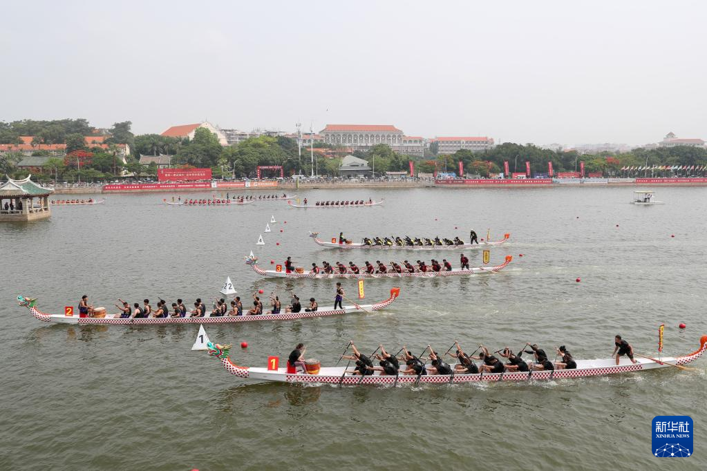 6月3日,在福建廈門集美龍舟池,來自海峽兩岸的龍舟隊競渡爭先。
