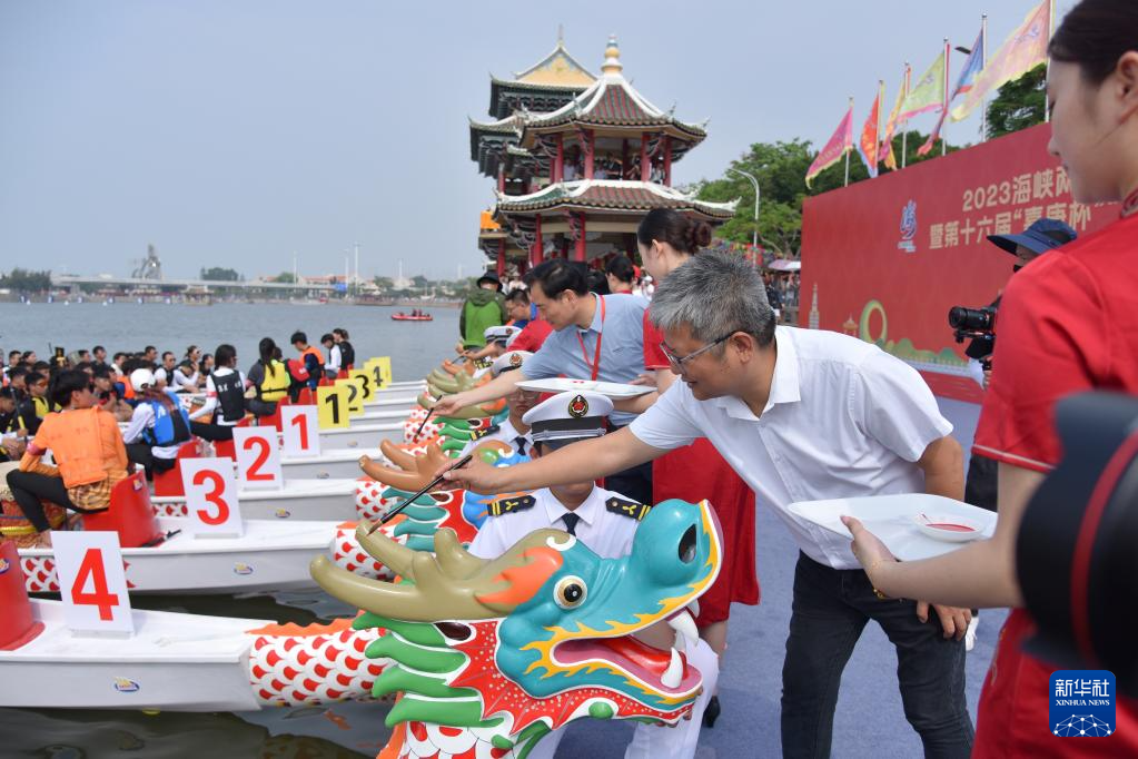 6月3日,開幕儀式上嘉賓為海峽兩岸龍舟賽進行龍舟點睛儀式。