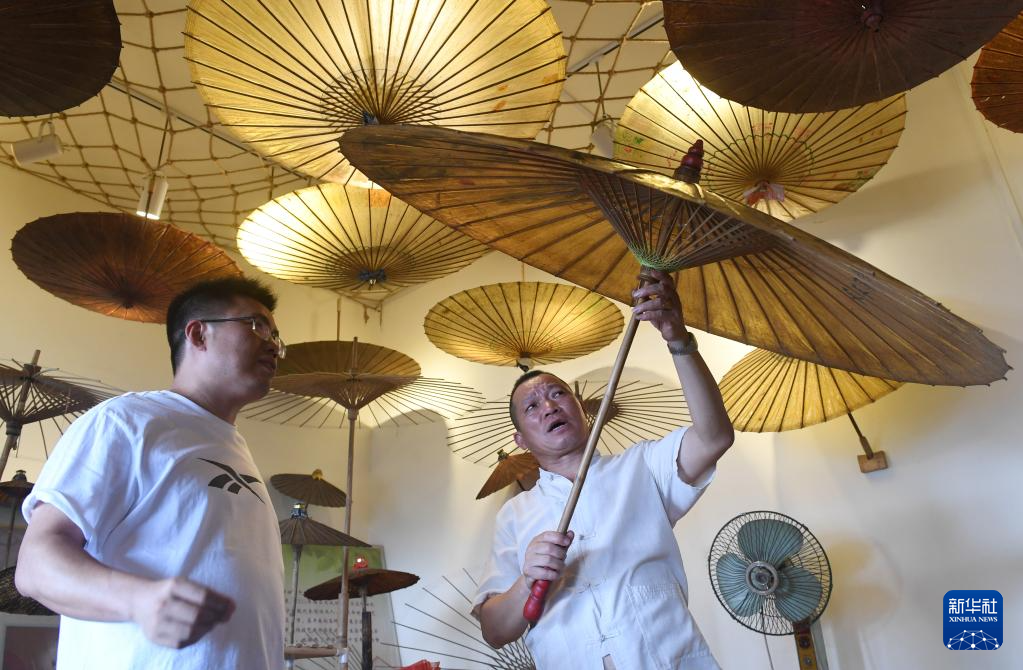 6月1日,在廣西賓陽縣賓州鎮陸村,陸云崗(右)在介紹油紙傘制作技藝。