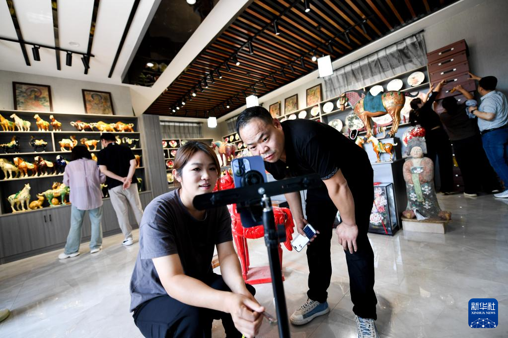 6月6日,工作人員在南石山村的唐三彩商鋪內通過手機直播銷售唐三彩。