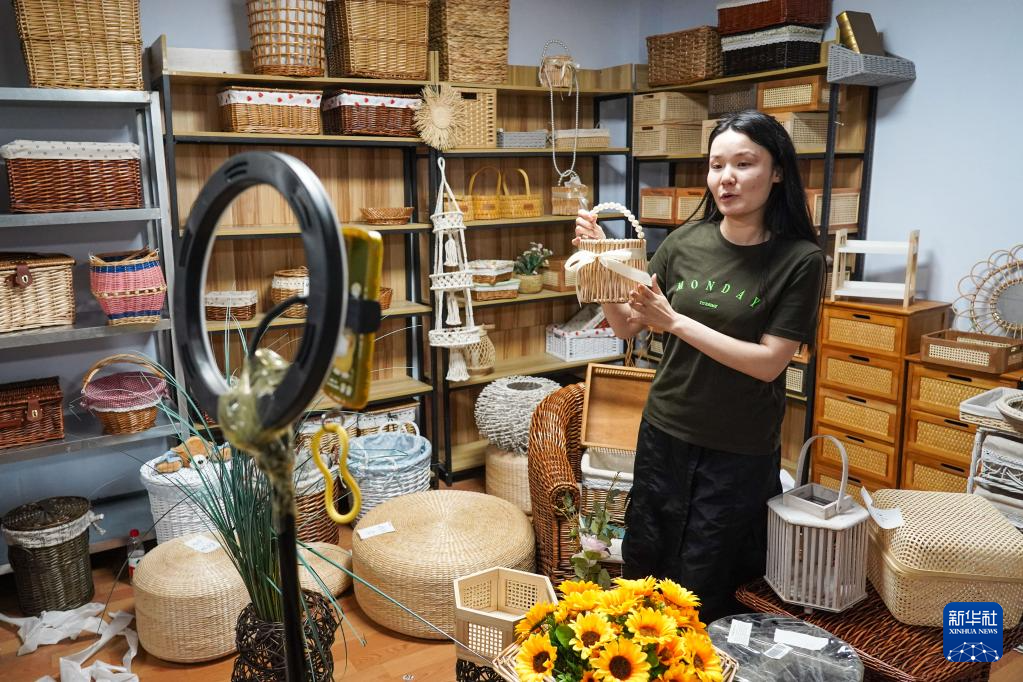 6月6日,臨沂金柳工藝品有限公司員工在電商平臺銷售柳編產品。