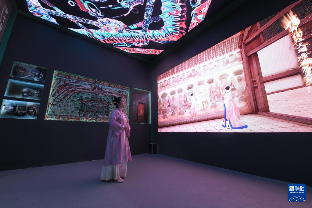6月8日,一名身著傳統服飾的觀眾在文博會甘肅展臺觀看數字敦煌展覽。