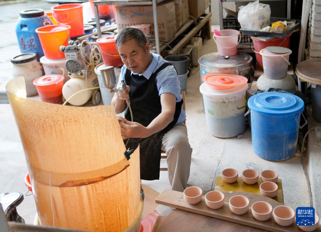 6月7日,劉法星在松陽縣家中為瓷器素胎噴釉。