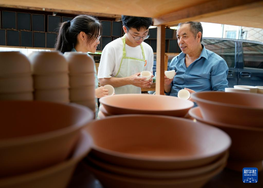 6月8日,劉法星(右)為兩名徒弟講解制瓷工藝相關知識。