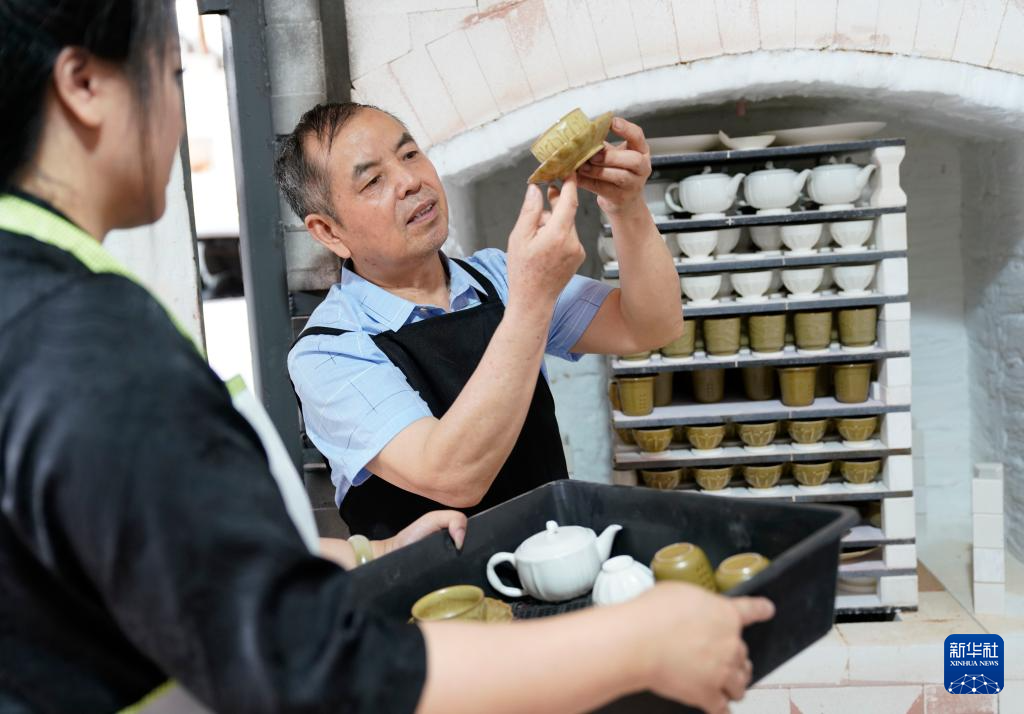 6月7日,劉法星在松陽縣家中的工作室內查看新出窯的純亞光釉瓷器。