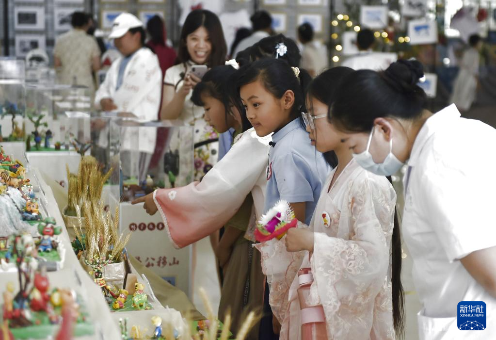 6月8日,學生們在活動現場參觀展出的非遺作品。
