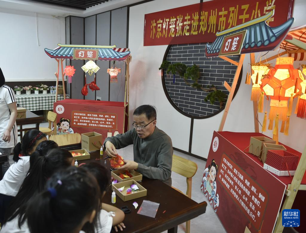 6月8日,學生們在活動現場觀看非遺項目“汴京燈籠張”的彩燈制作技藝。