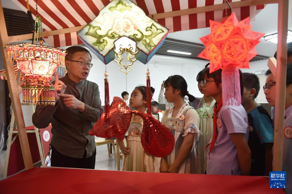 6月8日,學生們在活動現場觀賞非遺項目“汴京燈籠張”的彩燈作品。