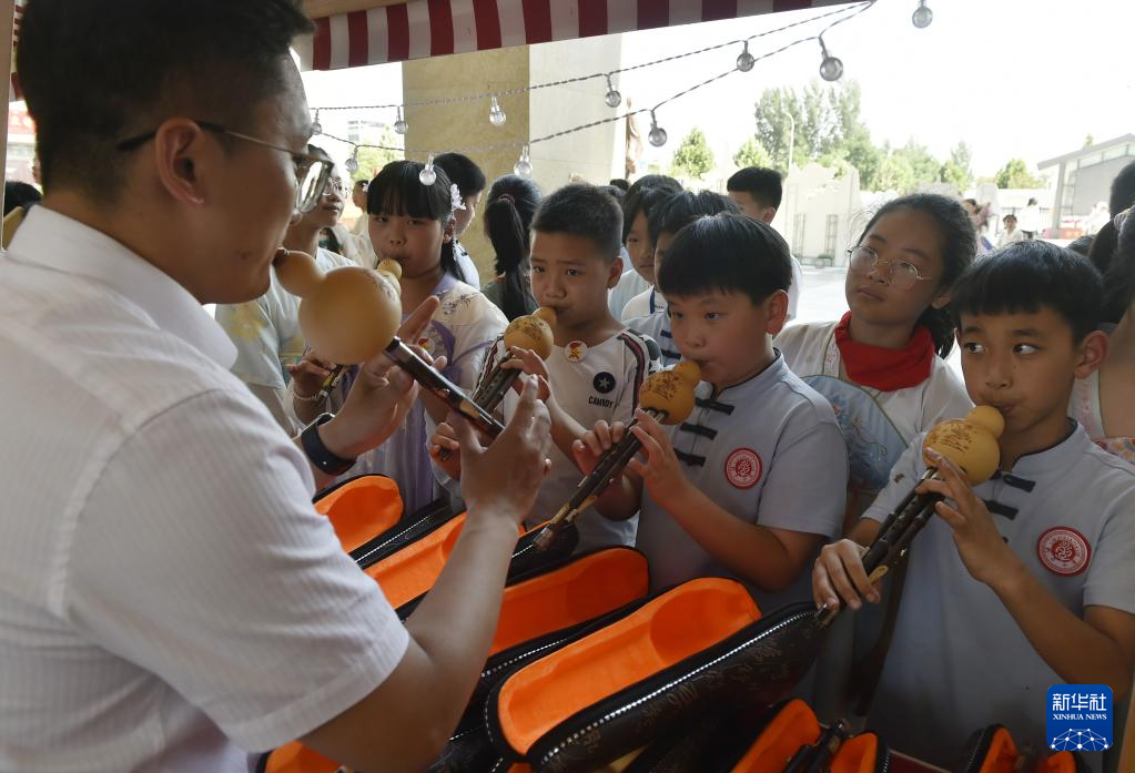 6月8日,學生們在活動現場體驗吹奏葫蘆絲。