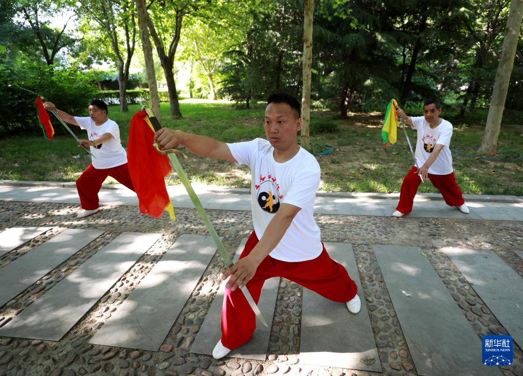 6月9日,太極拳愛好者在河北省邢臺市任澤區人民廣場展示王其和太極拳器械太極劍。