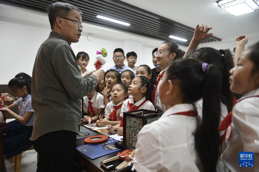6月8日,張俊濤(前左)在鄭州經濟技術開發區列子小學參加非遺進校園活動,向學生們介紹彩燈制作技藝。