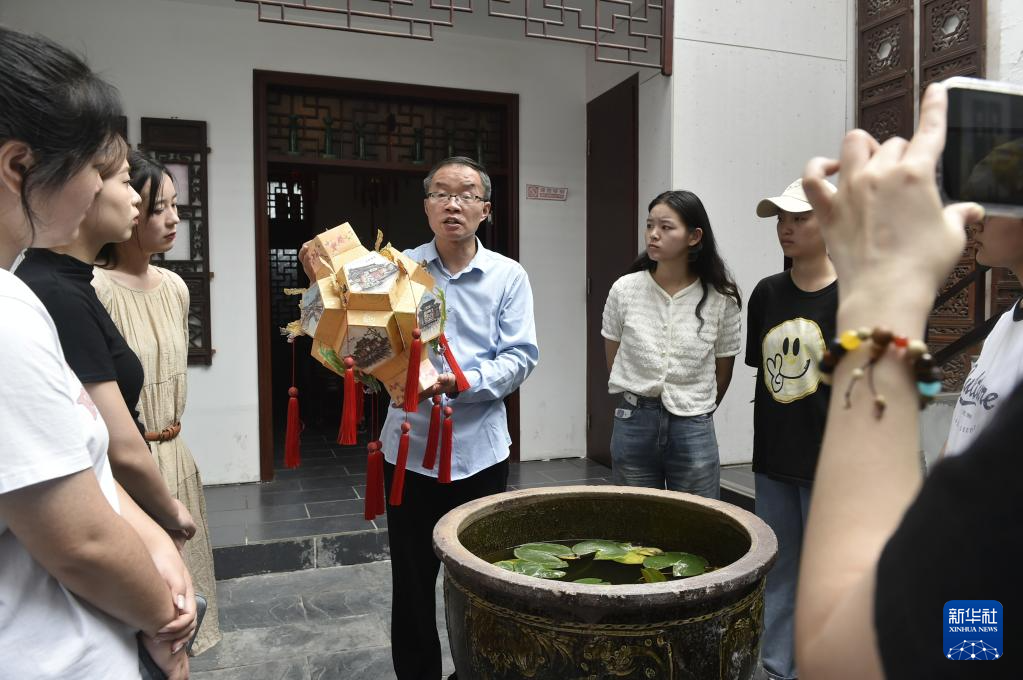 6月7日,張俊濤(中)在開封市“汴京燈籠張”彩燈展覽館內向來訪的大學生們介紹彩燈制作技藝。