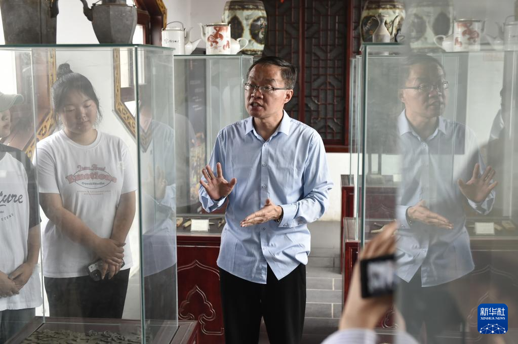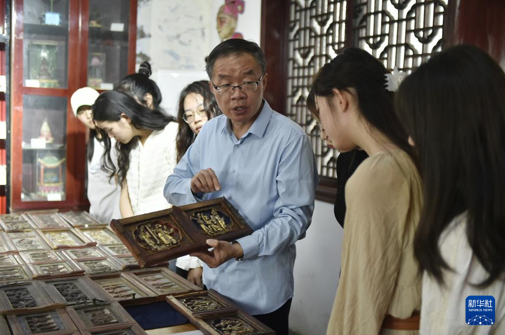 6月7日,張俊濤在開封市“汴京燈籠張”彩燈展覽館內向來訪的大學生們介紹自己收集的家用傳統木雕。
