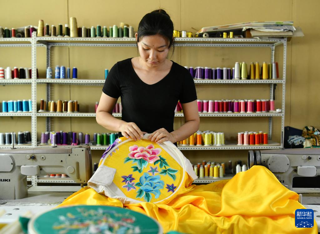 6月13日,河北省肅寧縣邵莊鄉東高家口村一家戲曲服裝廠的工人在繡制戲曲服裝。
