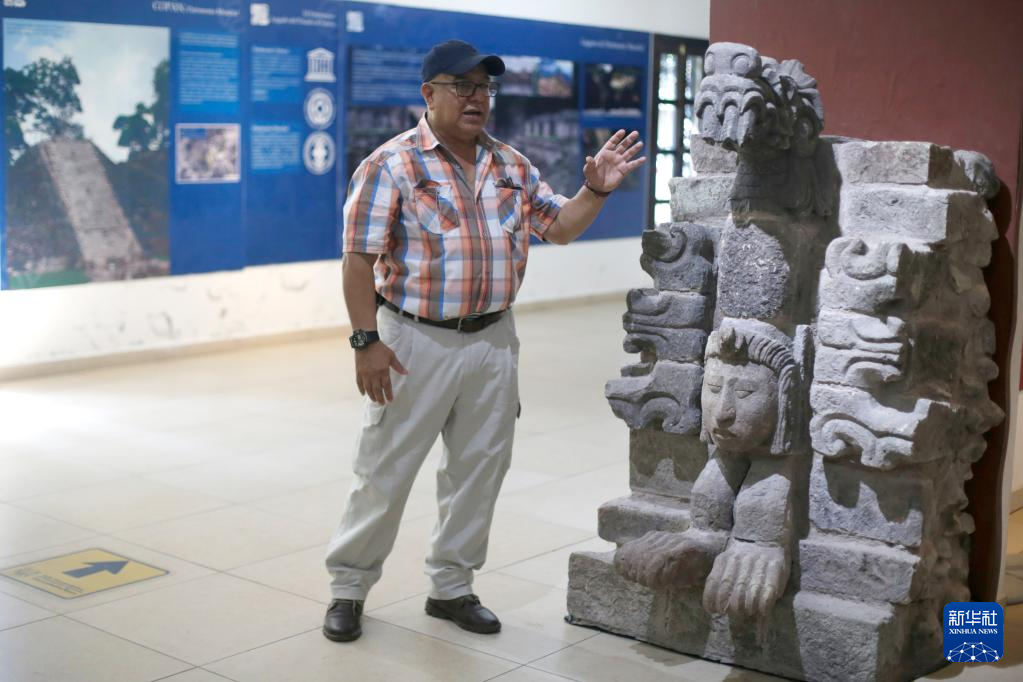 6月8日,在洪都拉斯科潘遺址入口陳列廳,洪都拉斯人類學和歷史研究所西部地區代表薩爾瓦多·馬丁內斯介紹聯合考古隊發現的龍頭雕像。新華社發(盧西奧·塔沃拉攝)