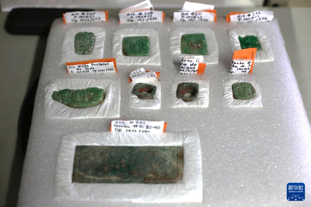 這是6月8日在洪都拉斯科潘瑪雅遺址國際考古隊倉庫內拍攝的由聯合考古隊發掘出的玉器。新華社發(盧西奧·塔沃拉攝)
