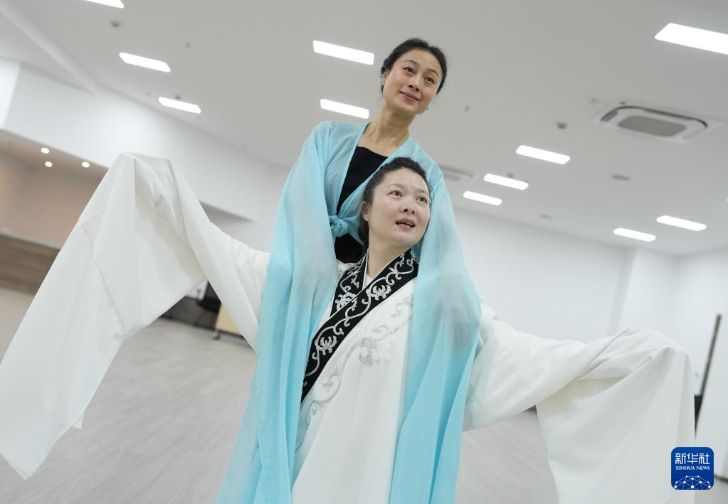 在位于杭州的浙江越劇團,演員謝莉莉(上)和汪喜喜在排練講述宋代詞人的新編越劇《張玉娘》(6月9日攝)。