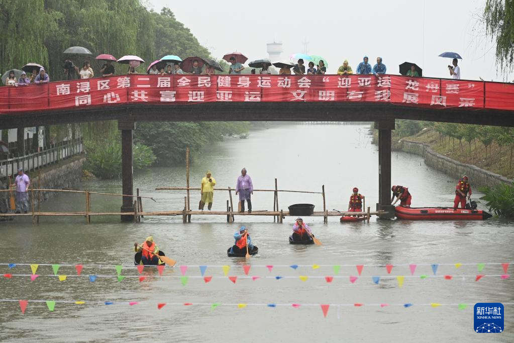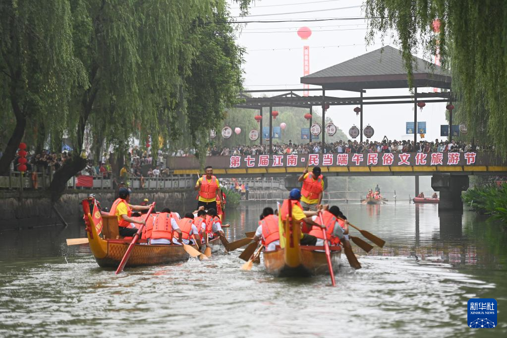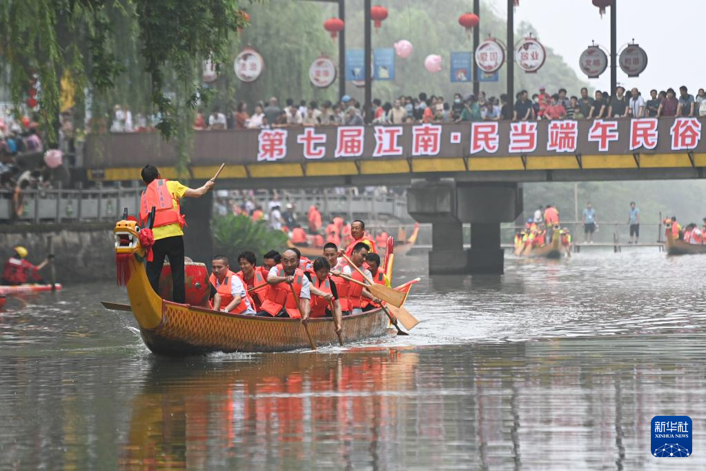 當日,浙江省湖州市“我們的節日·端午”暨第七屆江南·民當端午民俗文化旅游節在南潯區和孚鎮民當村開幕,來自南潯區各個鄉鎮的農民選手在河道中賽龍舟、劃菱桶,體驗傳統端午民俗。