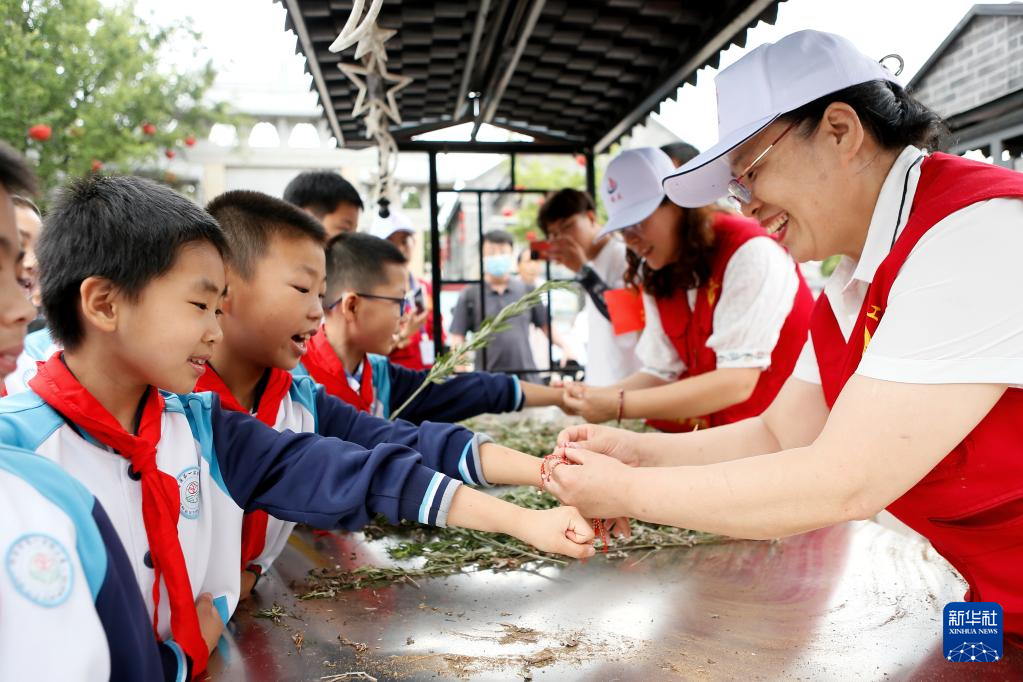 6月20日,山東省青島市即墨區的志愿者為即墨區第一實驗小學的學生佩戴五彩線。