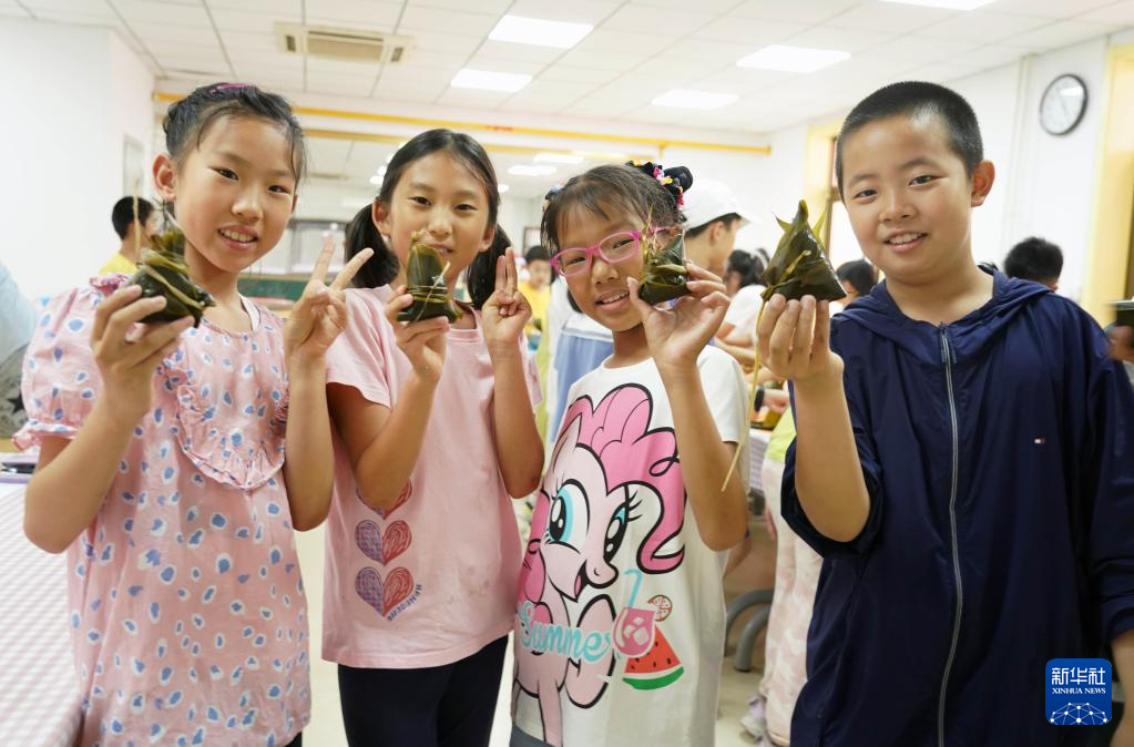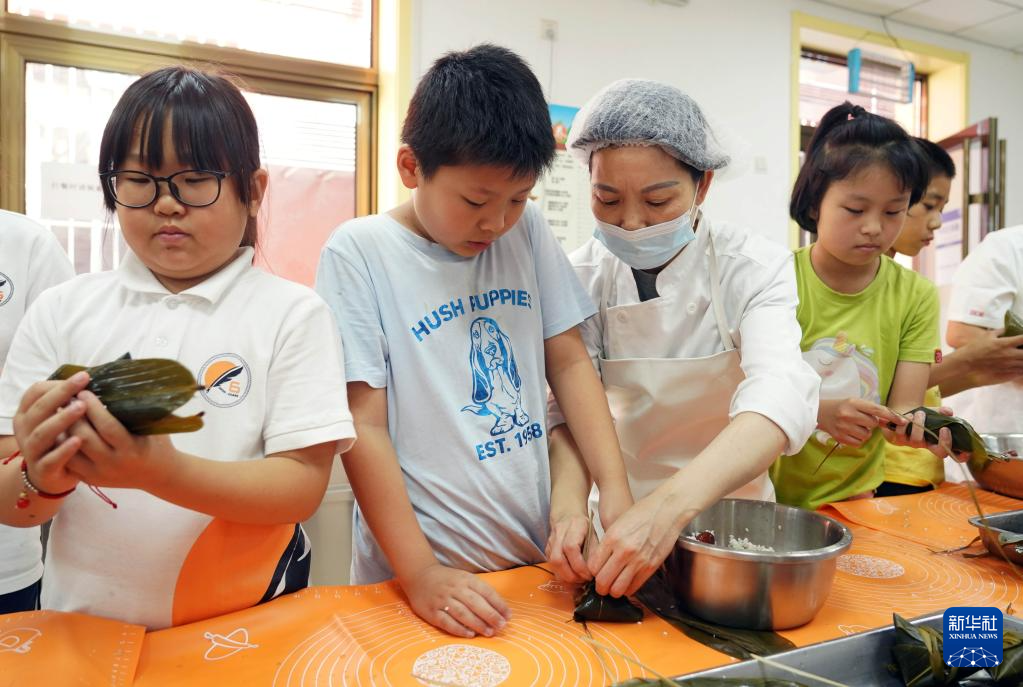 6月20日,在位于北京的人大附中實驗小學,學生在廚藝課上包粽子。