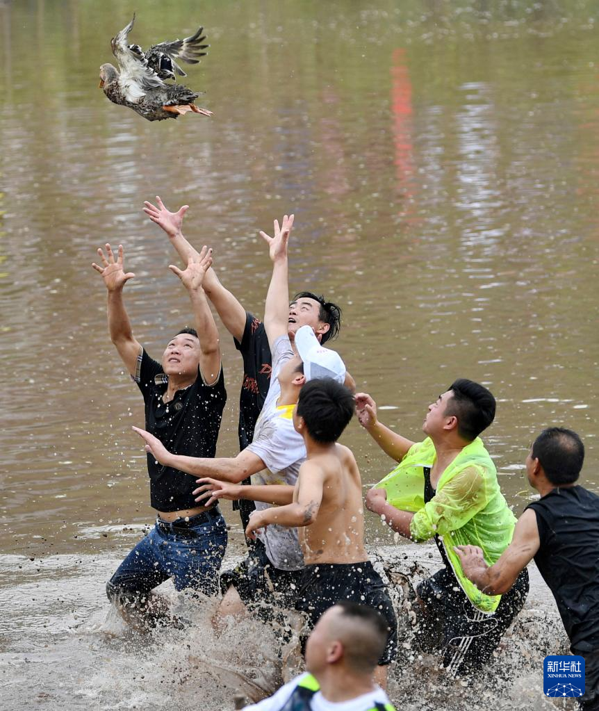 6月20日,四川省南充市順慶區雙橋鎮龍嶺村村民參加趣味搶鴨子比賽。