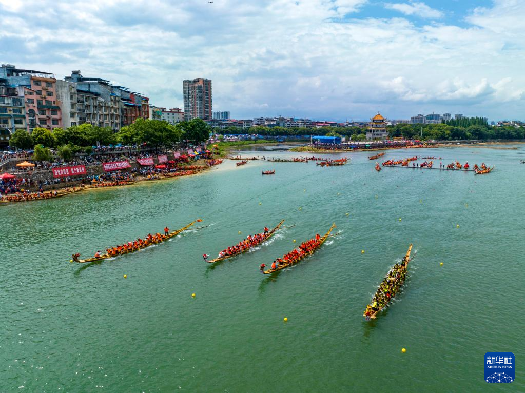 6月20日,龍船隊在湖南道縣瀟水河上競渡(無人機照片)。