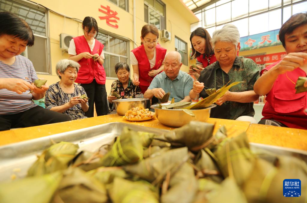 6月20日,志愿者在山東省臨沂市沂南縣眾康老年公寓與老人一起包粽子。