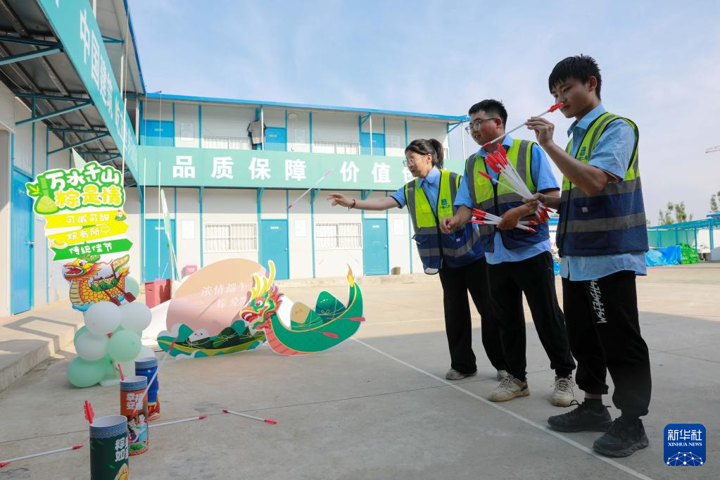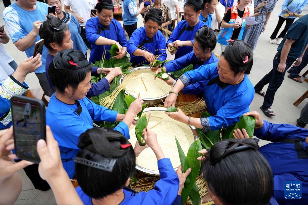 6月20日,在貴州省黔東南苗族侗族自治州丹寨縣金泉街道搬遷群眾安置社區,人們參加包粽子比賽。