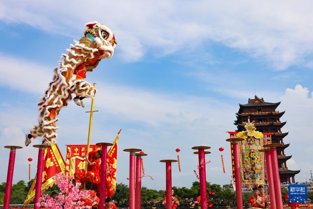 6月20日,在廣西玉林園博園,演員進行舞獅表演。