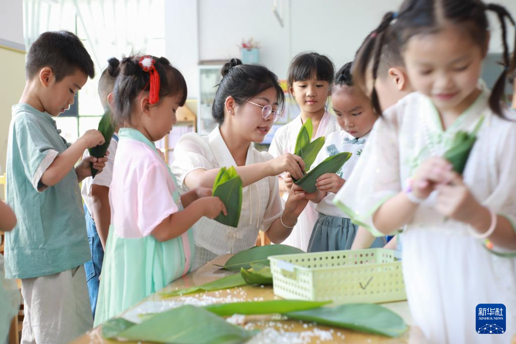 6月20日,在貴州省黔東南苗族侗族自治州岑鞏縣第二幼兒園,老師在教小朋友包粽子。