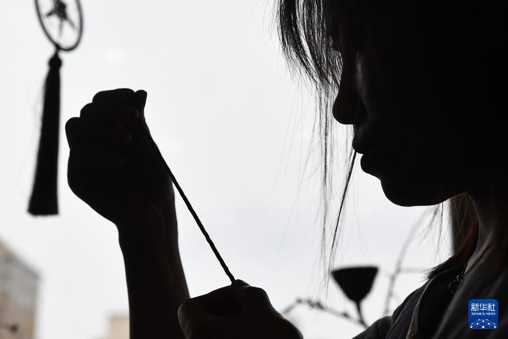 6月20日,在吉林省長春市,徐曉雪編繩結工藝品。