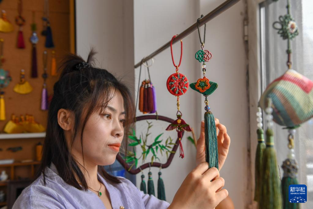6月20日,在吉林省長春市,徐曉雪整理繩結工藝品。