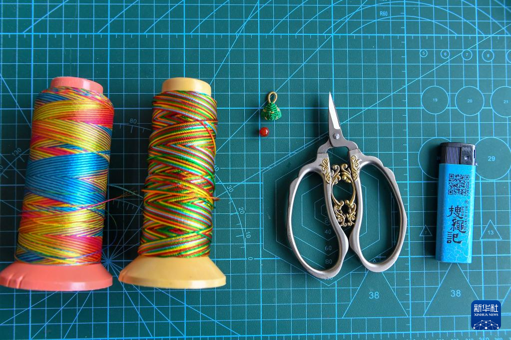 在位于吉林省長春市的徐曉雪工作室內拍攝的制作繩結工藝品的材料和工具(6月20日攝)。